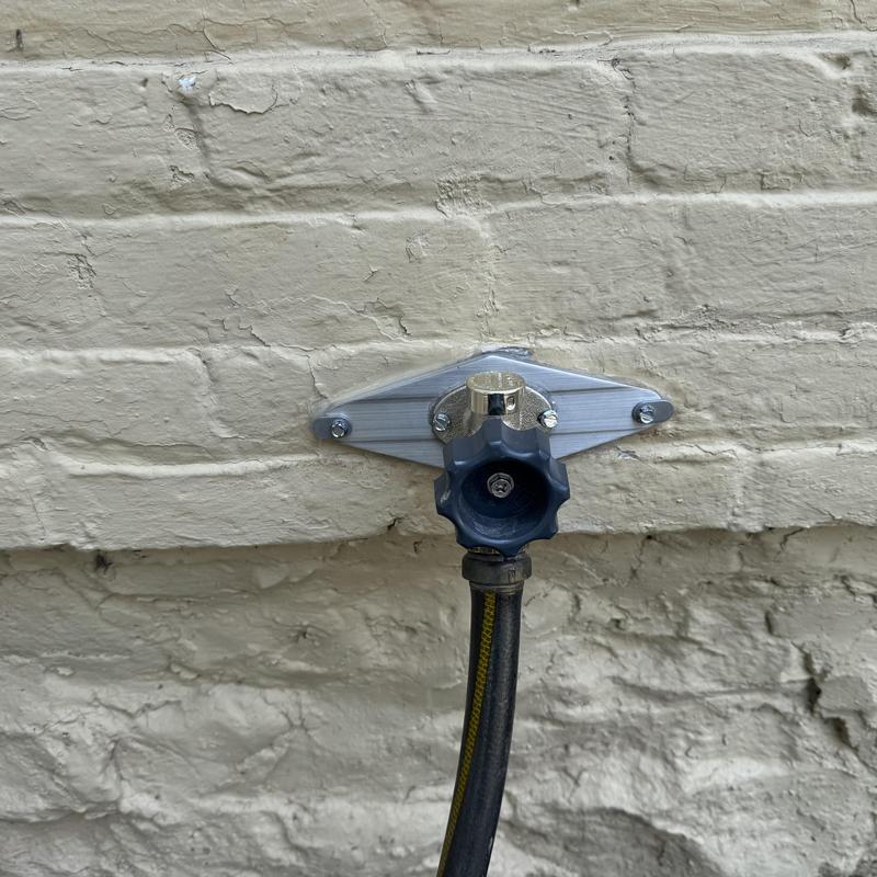Steve's Waterworks Plumbing installed a hose bib mounting plate to repair a damaged opening through brick. The hole had compromised the structure, requiring secure reinforcement. This plumbing repair service was completed in Rochester Hills, Michigan.