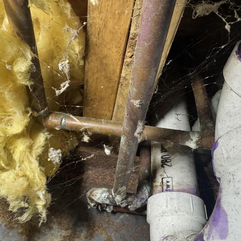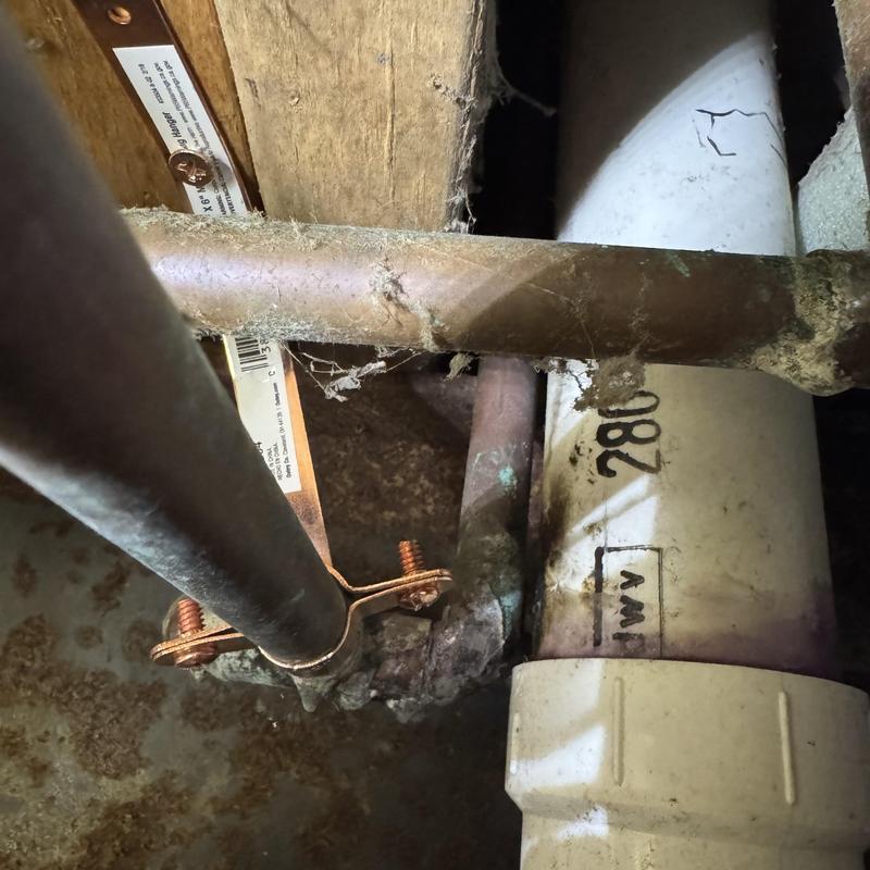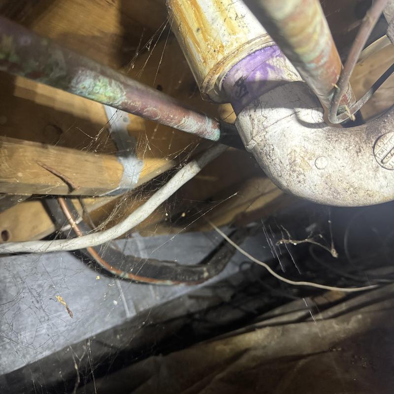 A plumber in Commerce Township, Michigan replaced a leaking P-trap and floor drain in a crawl space. They adjusted a copper water line to reduce pipe noise and added two brass and stainless washer machine arresters to prevent water hammer during laundry use.