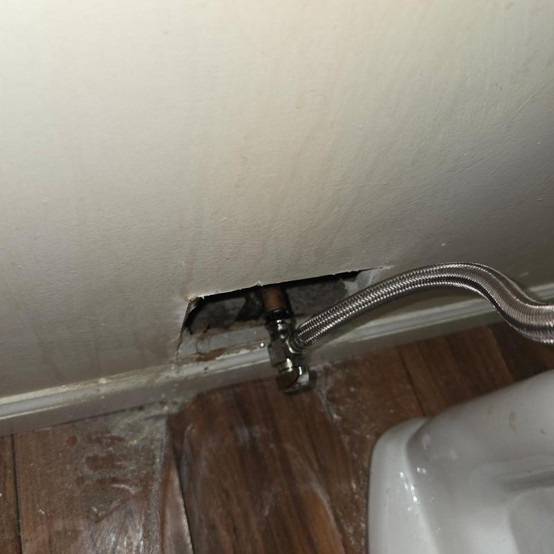A plumber in Oxford, Michigan replaced a burst toilet angle stop that caused interior flooding. The plumber cut into the drywall to access and install a new shut-off valve, restoring water control and preventing further damage.