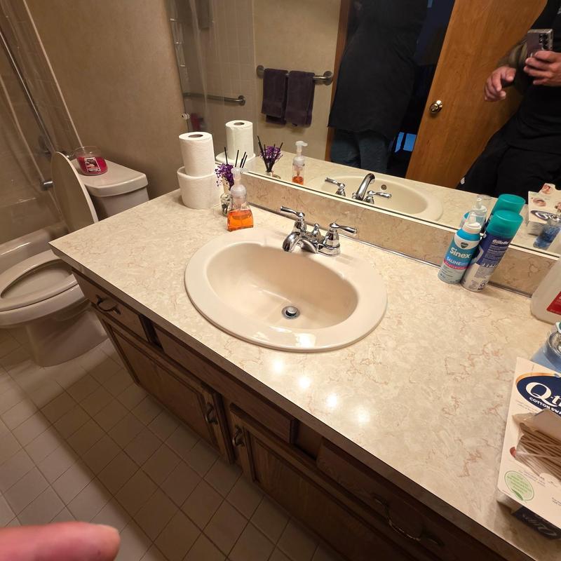 A plumber in Farmington Hills, Michigan, replaced two leaking vanity faucets with customer-supplied silver widespread units. The service involved removing the old faucets and installing new fixtures to restore proper function in a bathroom setup.