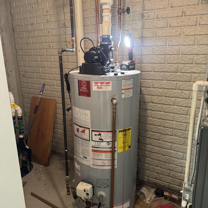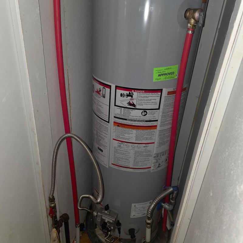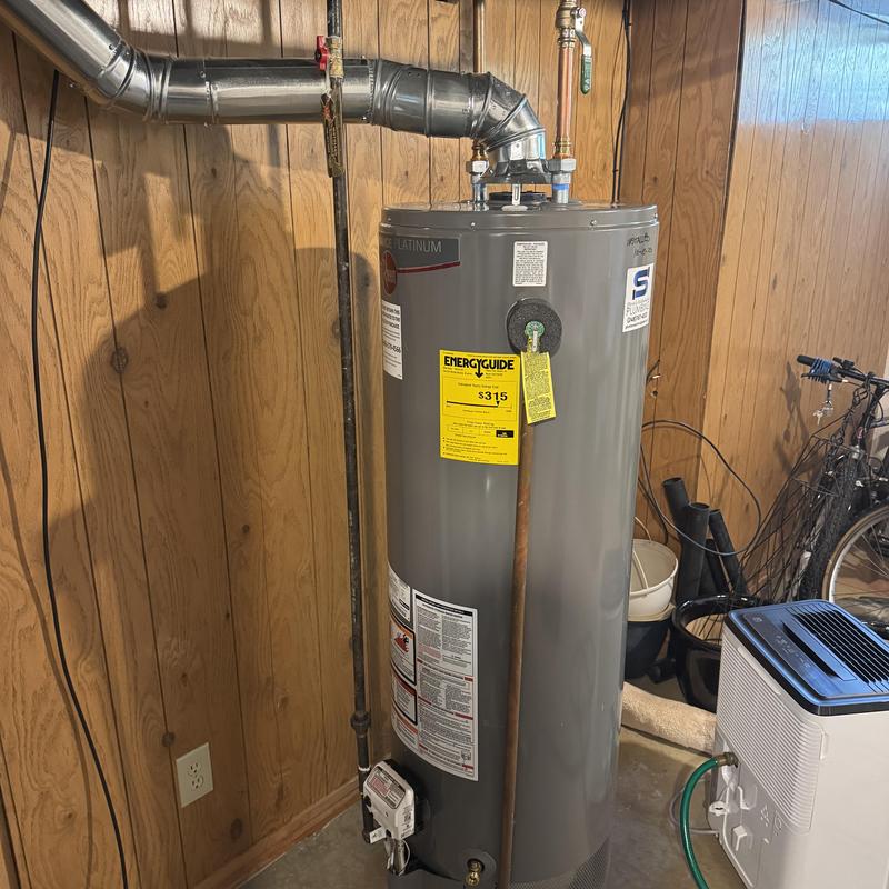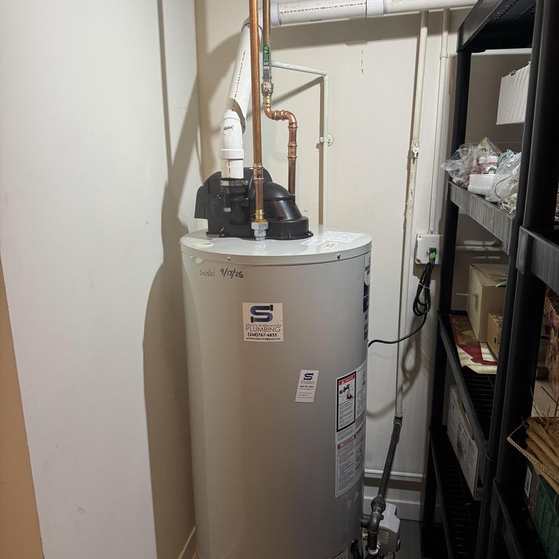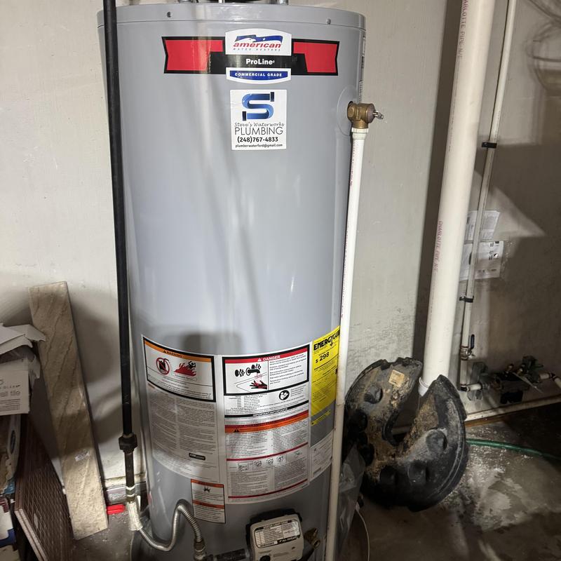 Steve's Waterworks Plumbing replaced a 50-gallon natural vent water heater in Sterling Heights, MI. The job included draining and removing the old unit, installing a new Rheem water heater, modifying the gas and vent lines, installing dielectric unions, adjusting copper water lines, and adding a drain pan to prevent basement flooding.