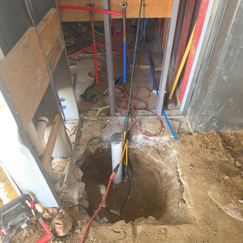 Steve's Waterworks Plumbing completed underground setup and rough-in installation for a mop sink in Bloomfield Hills, Michigan. The work included placing plumbing lines below the surface and preparing connections for future sink installation.