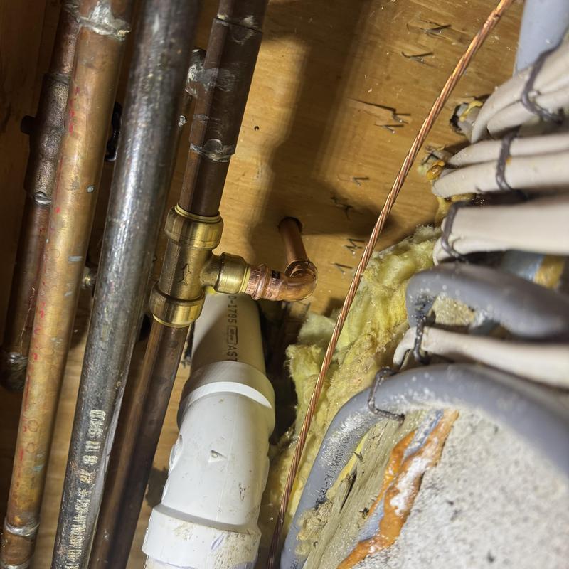 A technician in West Bloomfield Township, Michigan removed an outdated saddle valve from a copper water line and installed a tee fitting to connect an angle stop for an ice maker. This upgrade improves water line safety and provides a more secure connection for appliance supply lines.