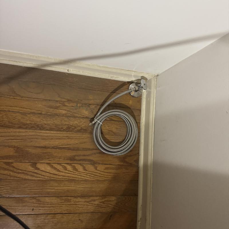 A plumber in Bloomfield Hills, Michigan installed a braided supply line and a shutoff valve for an ice maker. This setup helps connect the appliance to the water supply while allowing easy control of water flow for maintenance or emergencies.