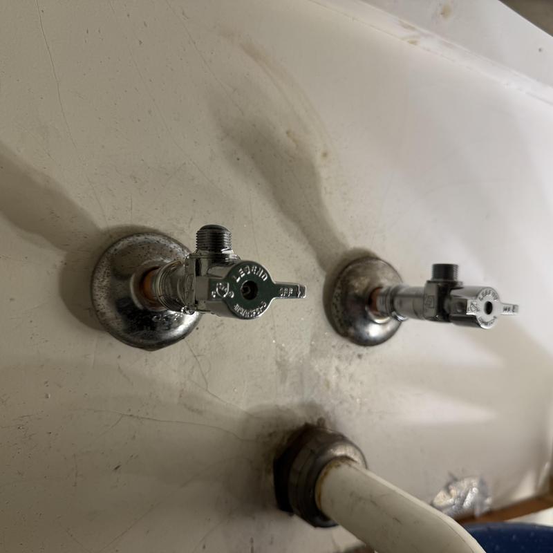 A plumber installed two new angle stops under a vanity sink in a basement bathroom. This plumbing service was completed in Farmington Hills, Michigan.