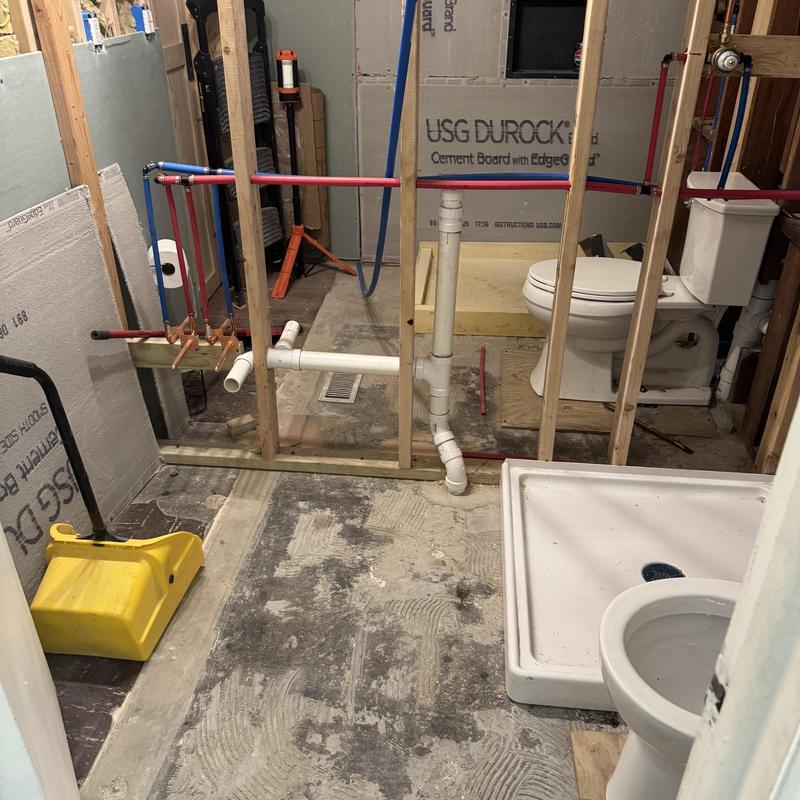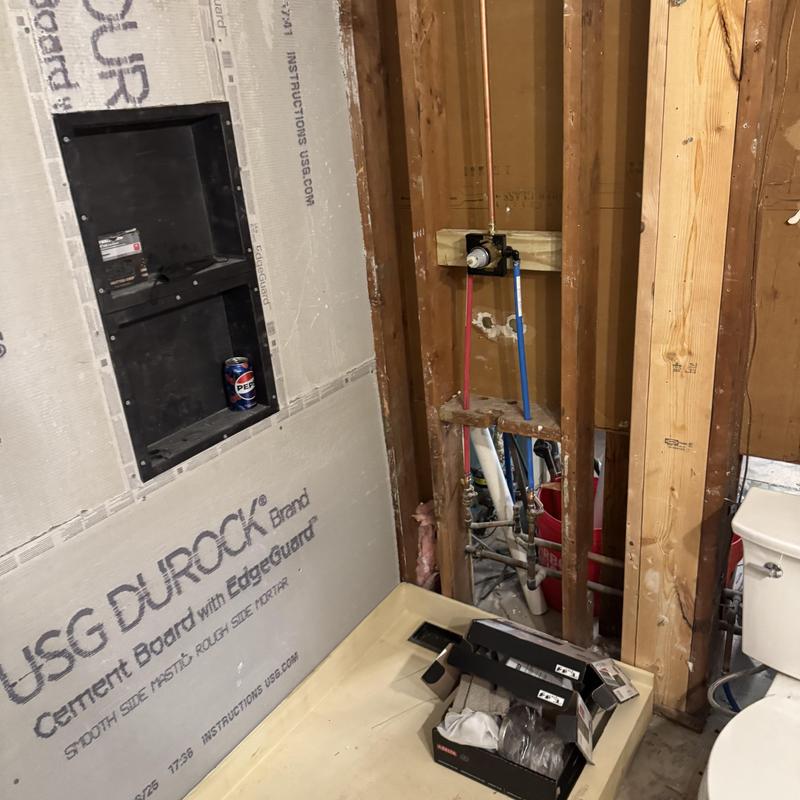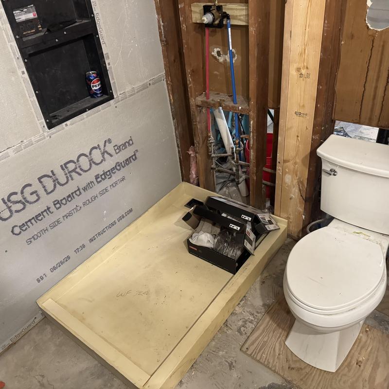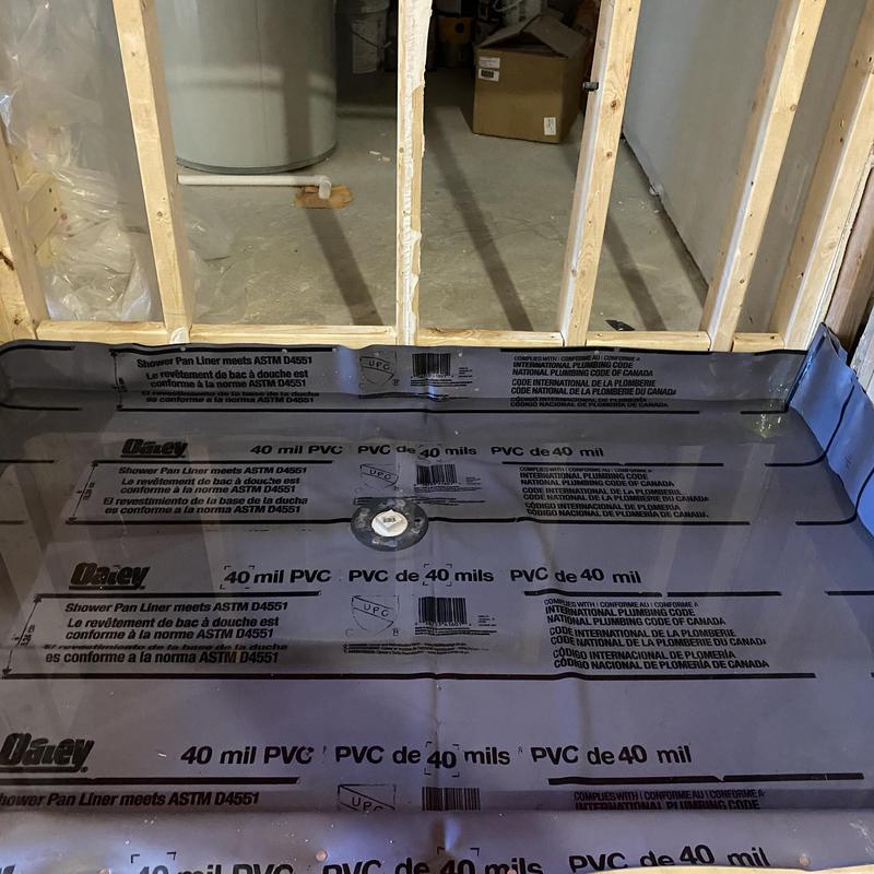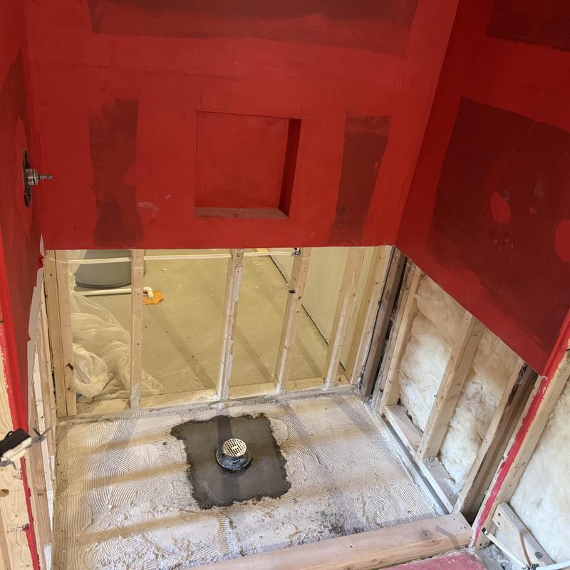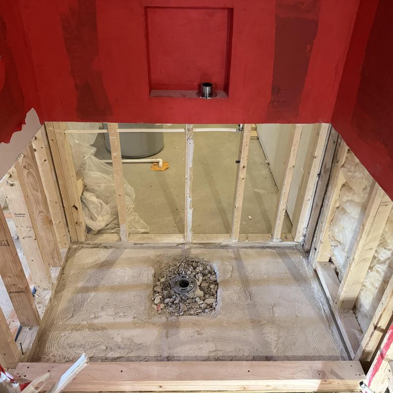 A plumber in Troy, Michigan completed an emergency bathroom remodel. The contractor broke concrete to install a new shower drain, built a curb, added a membrane with water for a rough inspection, and ran water lines for a vanity and toilet.