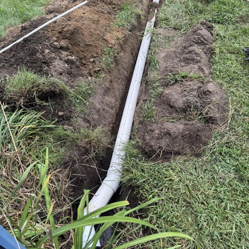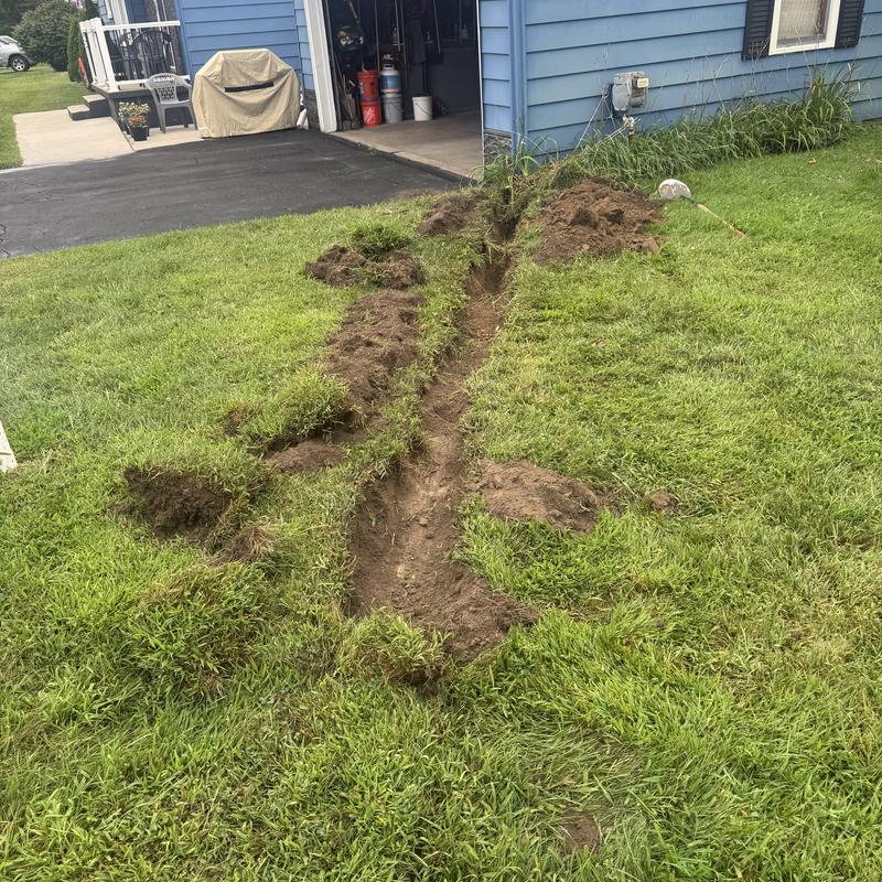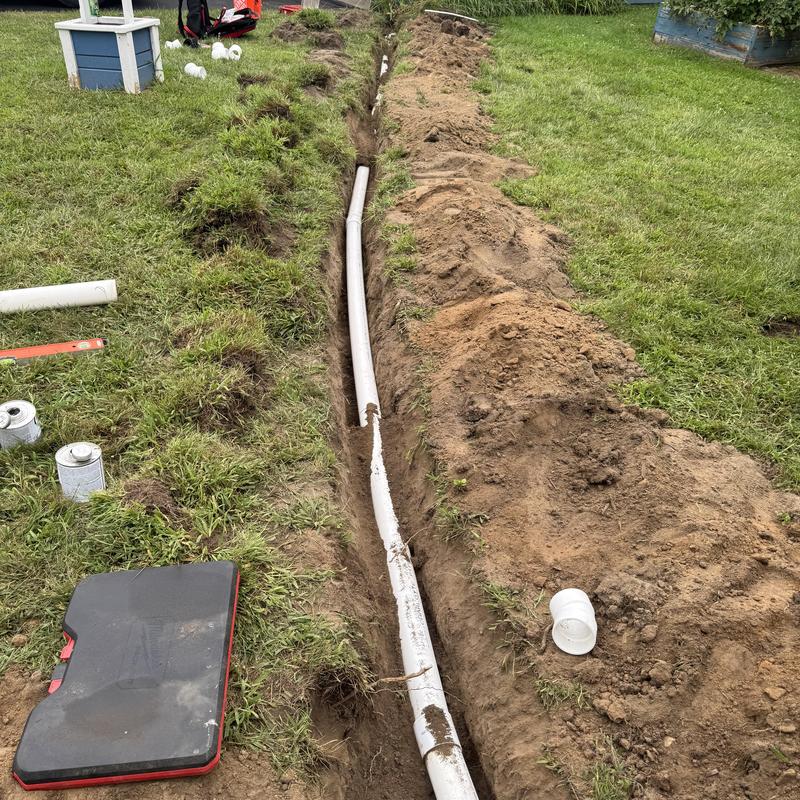 Steve's Waterworks Plumbing hand dug a trench for a garage drain and installed PVC pipe leading to a yard ditch in Novi, Michigan. This work supports proper water flow and helps reduce pooling issues around the garage.