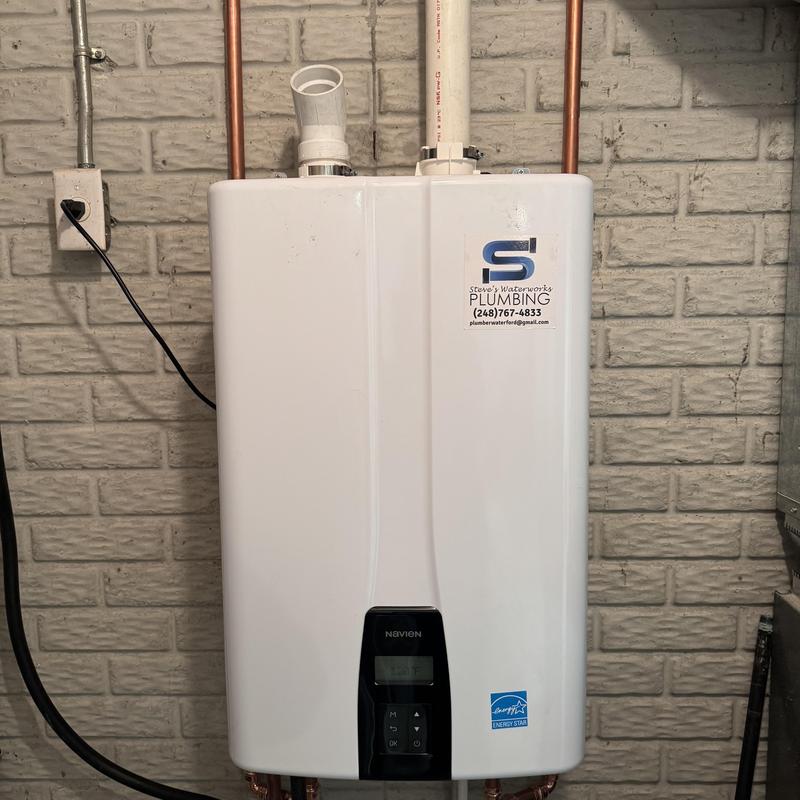 Steve's Waterworks Plumbing removed a leaking 50-gallon power vent water heater and installed a Navien tankless water heater in West Bloomfield, Michigan. This upgrade helps improve efficiency and saves space by replacing outdated equipment with a modern tankless system.