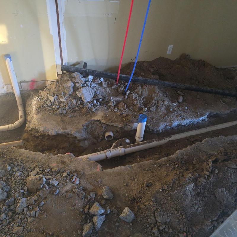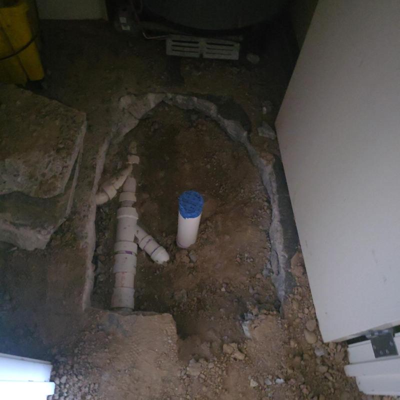 Steve's Waterworks Plumbing replaced a damaged pipe with a new PVC pipe after opening the floor and exposing the broken section. They completed the job by sealing the area with cement. This plumbing repair took place in Novi, Michigan.