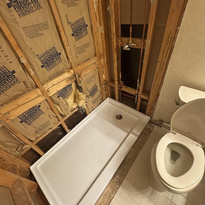 Steve's Waterworks Plumbing removed cast iron tub and shower walls, installed a new shower pan, and replaced the existing drain with a p-trap in West Bloomfield, Michigan. The team also installed a new Delta shower valve, improving water flow and drainage for the updated bathroom.