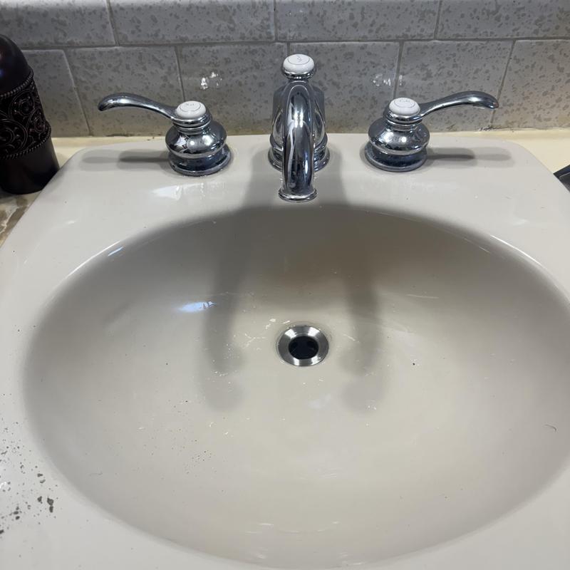 A plumber in Farmington Hills, Michigan, replaced two leaking vanity faucets with customer-supplied silver widespread units. The service involved removing the old faucets and installing new fixtures to restore proper function in a bathroom setup.