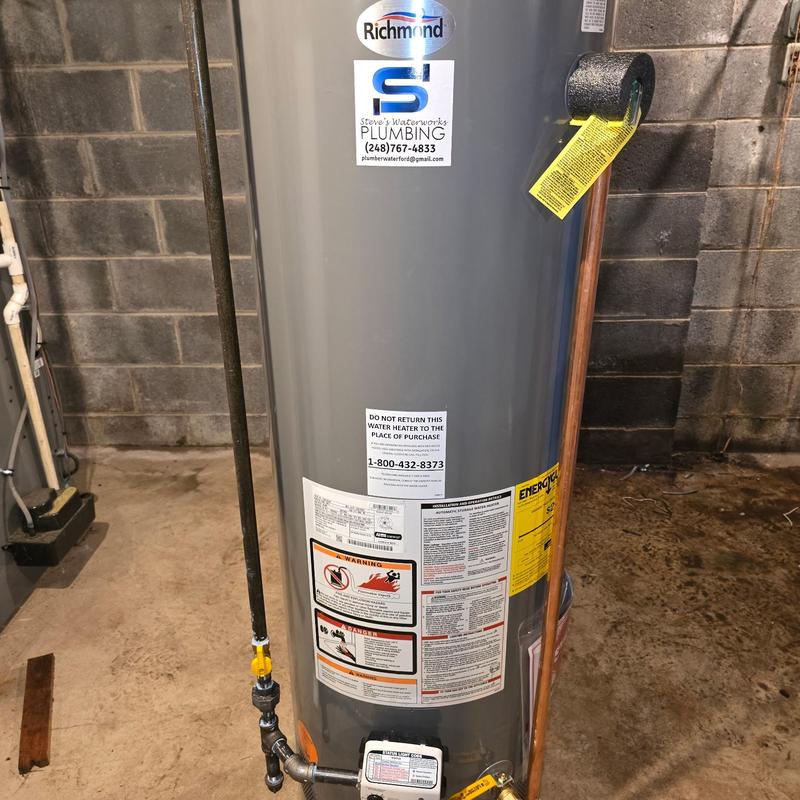 A plumber in Waterford, Michigan replaced a burst water heater that caused floor flooding. The emergency repair included installing a new 40-gallon water heater to restore hot water service quickly.